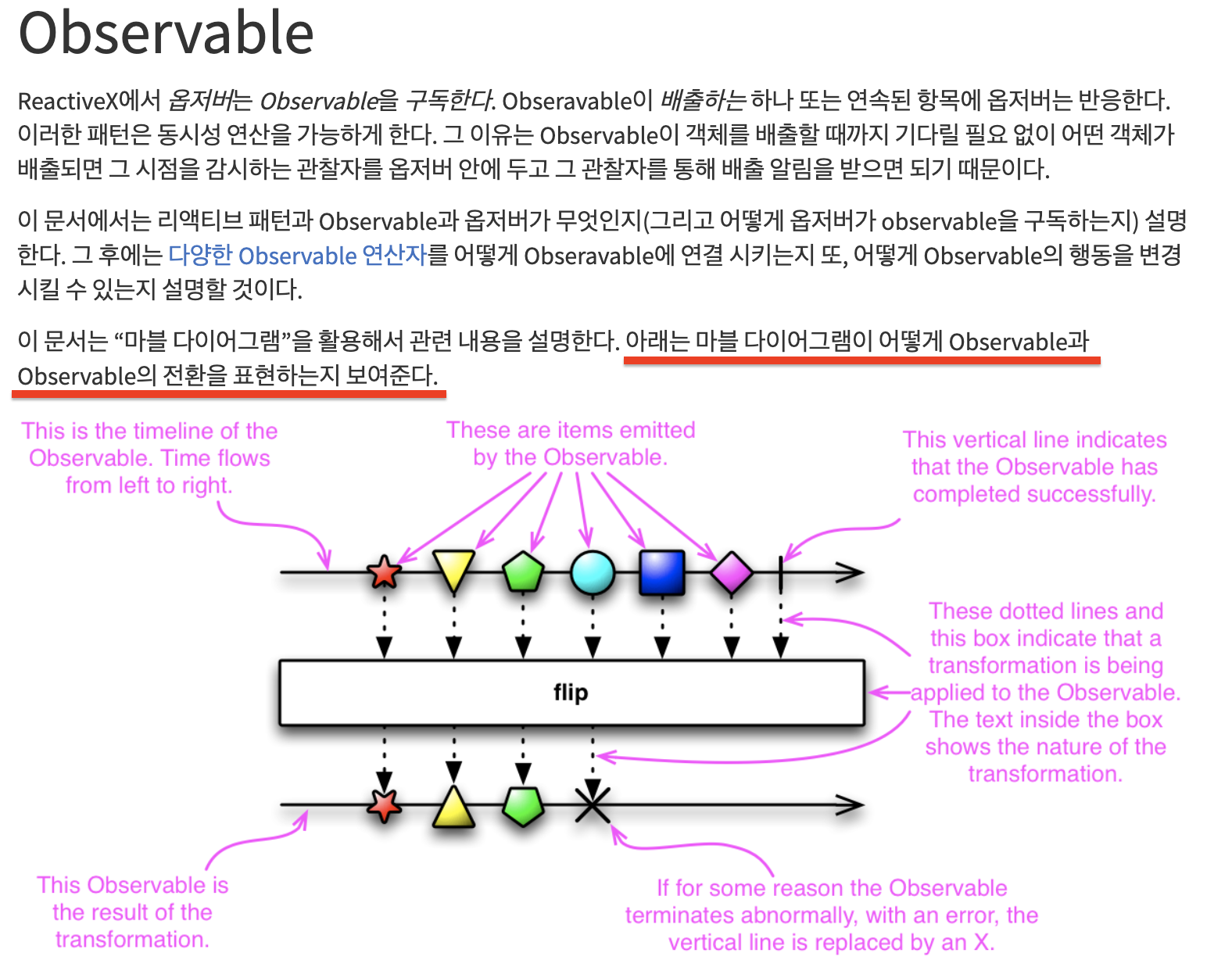 먼저 ReactiveX사이트에 들어가서 맨 위에 있는 Docs에 Observable을 클릭해보면...