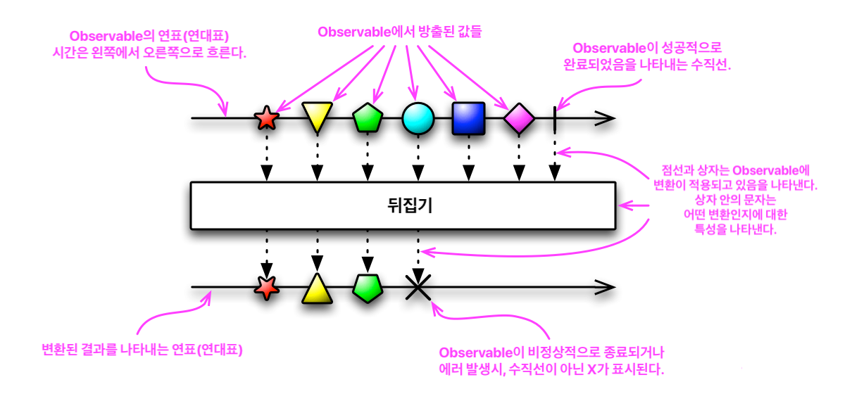 Observable에 어떠한 연산자(Operators)를 적용했을 때 생기는 변화를 도표로 표현한 것!