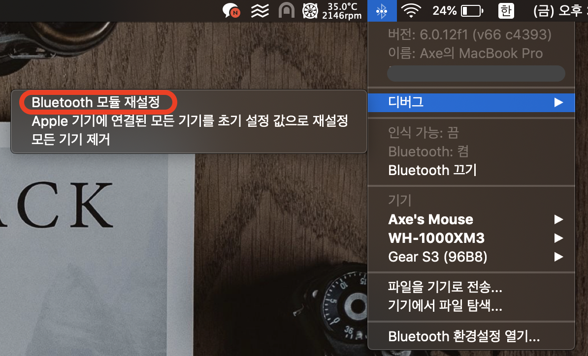 이렇게 뜨실 텐데요. 여기서 '디버그' -> 'Bluetooth 모듈 재설정'을 눌러주시면