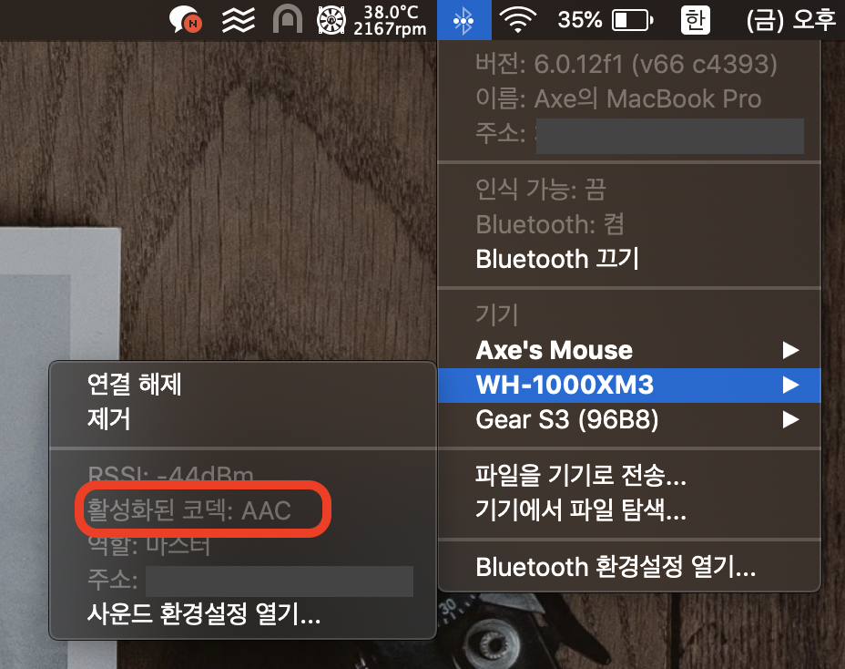 다시 연결이 되시면 다시 노래를 틀어 바뀐 코덱을 전에 설명한 것과 같은 방법으로 확인해줍시다. (옵션 키 + 메뉴바 블루투스 모양)