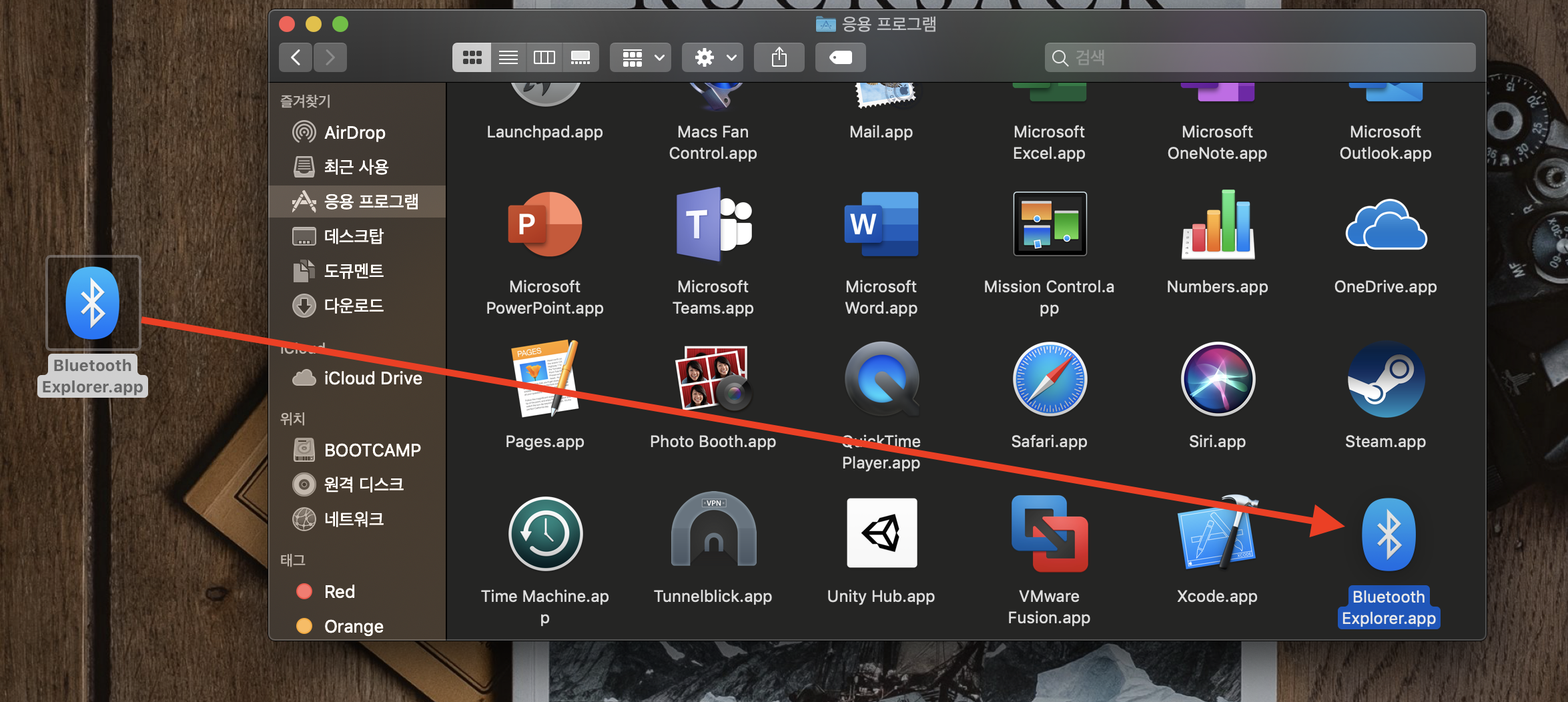 다운로드하신 후 'Bluetooth Explorer'를 '응용프로그램' 안으로 Drag&Drop 해줍니다.
