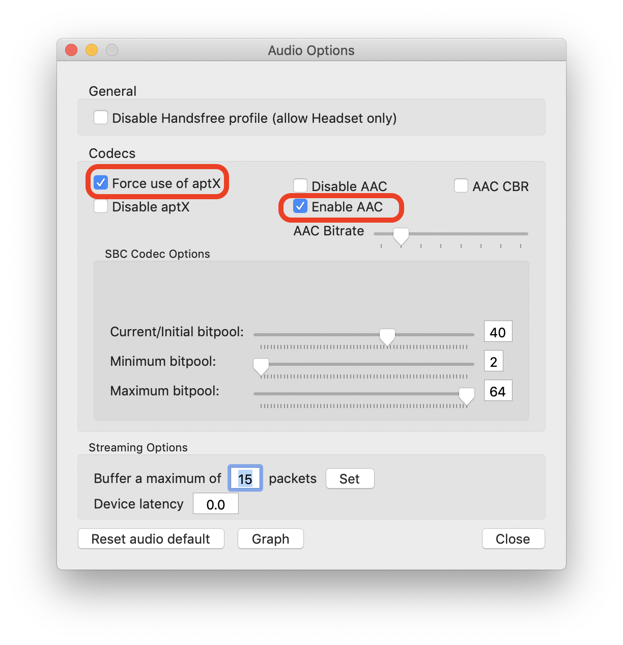 'Audio Options' 창이 뜨시면 'Force use of aptX'와 'Enable AAC' 이렇게 두 개가 있을 겁니다.